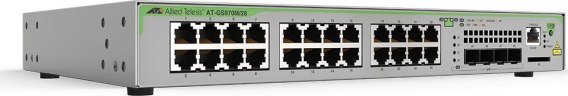 Przełącznik o prędkości magistrali wynoszącej 56 Gb/s, wyposażony w 24 gniazda sieciowe 10/100/1000 Mbps oraz 4 gniazda SFP+.