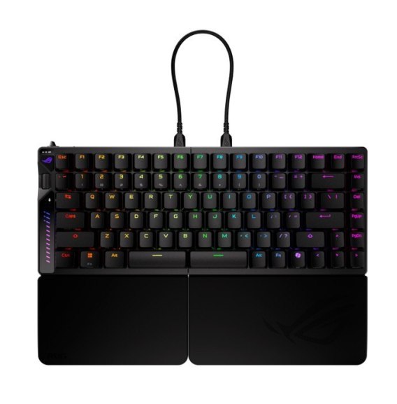 Klawiatura gamingowa ROG Falcata dzielona w 75% z przełącznikami magnetycznymi ROG HFX V2 z możliwością wymiany podczas pracy i czujnikiem Halla ROG; wyposażony w przełącznik Rapid Trigger, intuicyjne sterowanie i wielofunkcyjne pokrętło, łączność w trzech trybach z bezprzewodową technologią ROG SpeedNova 8K, tryb strefowy, czterowarstwowe tłumienie i odłączane silikonowe podpórki pod nadgarstki