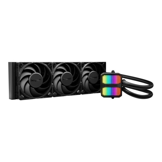Informacje dodatkowe: Wysoce zaawansowana konstrukcja bloku chłodzącego, Wydajna 3-komorowa konstrukcja pompy znacznie redukuje turbulencje i hałas, Wyciszona i regulowana pompa z 6-biegunowym silnikiem, 3 wysokoobrotowe wentylatory Silent Wings 4 120mm PWM z narożnikami do, radiatorów dla praktycznie niesłyszalnej pracy, Ekstremalnie wysoka wydajność chłodzenia, Elegancka konstrukcja premium z dyskretnym podświetleniem ARGB, Łatwo dostępny port do napełniania i dołączona butelka płynu chłodzącego, zapewniają długą żywotność, Elastyczne węże w oplotach i wygodny montaż zapewniają łatwą obsługę, Poziom hałasu (dB(A)) @ 50 % / 75% /100% rpm: 19.8 / 31.9 / 38.6, Prędkość pompy (rpm) 3500, Zakres pracy pompy (rpm) 1700 - 3500, Długość rurek (mm): 400, Otwór wlewowy, Złącze podświetlenia: 3 Pin 5V Adressable, Złącze pompy oraz wentylatorów: 4-pin PWM, Prędkość obrotowa wentylatora w 100% PWM (rpm) 2500, Model wentylatora: Silent Wings 4 120mm PWM, Wymiary wentylatora (mm): 120 x 120 x 25, Wymiary radiatora z wentylatorem (W x S x G), (mm): 397 x 120 x 27, Wymiary bloku chłodzącego (wys. x szer. x gł.), (mm): 93,5 x 80 x 56, Certyfikaty: CE, FCC, UKCA, W zestawie:, - Pasta termoprzewodząca, - Zestaw montażowy (Intel, AMD), - Przewód adaptera typu Y, - Butelka płynu chłodzącego (100 ml)