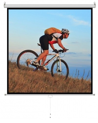 Ekran projekcyjny, półautomatyczny. Przekątna ekranu: 96-cal. Format obrazu: 1:1. Grubość materiału: 0.36 mm. Współczynnik odbicia światła: 1.0 gain. Materiał wykonania: matt white. Mocowanie do sufitu oraz ściany. Materiał obudowy: metal. Wysokość oraz szerokość powierzchni projekcyjnej: 244 x 244 cm.