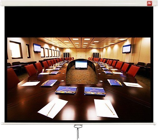 Ekran projekcyjny ścienny o wymiarach powierzchni projekcyjnej 230 x 144 cm w formacie 16:10. Powierzchnia projekcyjna Matt White. Blokada zabezpieczająca przed zwijaniem.