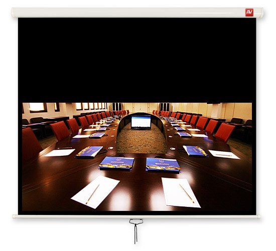 Ręczny ekran projekcyjny do montażu ściennego. Format obrazu: 16:9. Wymiary ekranu: 200 x 200 cm. Rozwijany ręcznie.