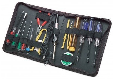 Zestaw narzędziowy do montażu komputerów PC w zapinanym na zamek etui. W skład zestawu wchodzą różnego rodzaju wkrętaki, antystatyczne narzędzia: do montażu oraz demontażu układów scalonych, cyna, odsysacz cyny i lutownica, wąskie cęgi, mała tuba na śrubki.