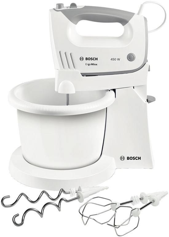 Mikser ręczny o mocy 450W, z 5 stopniami prędkości, z funkcją pracy pulsacyjnej turbo, 2 końcówkami do ubijania, 2 hakami do ciasta oraz stojak z misą obrotową