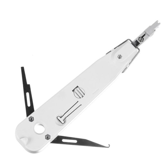 Informacje dodatkowe: służy do instalacji przewodów w złączach typu Krone oraz Dual Block, sprężyna wyzwalająca uderzenie podczas zaciskania przewodu, regulowana siła uderzenia, nożyce automatycznie ucinające nadmiar przewodu, wbudowane dwa dodatkowe narzędzia przydatne przy instalacji, blokada uderzenia (poprzez obrócenie włącznika lub zablokowanie zapadki), blokada odcinania (poprzez obrócenie włącznika lub zablokowanie zapadki), kolor szary