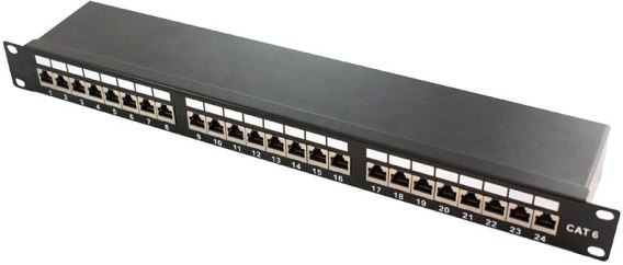 Patchpanel wyposażony w 24 porty RJ-45. Kategoria: 6A. Dedykowany model: Szafa Rack 10-cal oraz 19-cal. Ekranowany. Materiał wykonania: Metal. Certyfikat CE oraz RoHS.