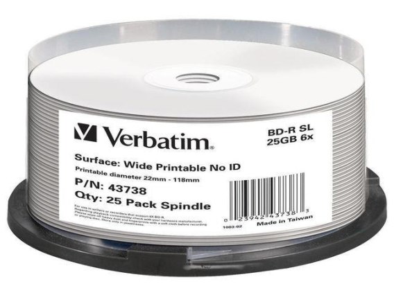 Informacje dodatkowe: Profesjonalne nośniki optyczne Verbatim można rozpoznać po znaku, DataLifePlus., Powierzchnia: Wide Printable - No ID Brand, Obszar zapisywania: 22-118mm, Ten dysk jest zgodny ze specyfikacją BD-R w wersji 1.3.