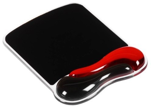 Podkładka pod mysz komputerową w kolorze czarno-czerwonym. Podkładka z żelową podpórką pod nadgarstek. Wykonana z miłego i wytrzymałego materiału. Pozwala na pracę myszą kulkową lub optyczną. Posiada antypoślizgowy spód.