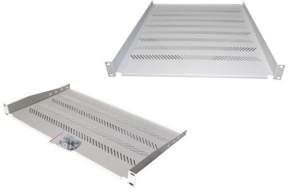 Półka koloru szarego. Montaż z przodu (2 punkty). Szerokość wynosi 19 cali, wysokość to 1U, a głębokość wynosi 250 mm.