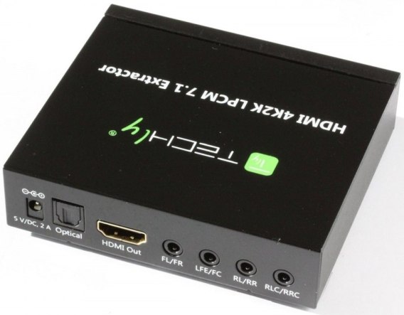 Przełącznik marki Techly. Umożliwia wyodrębnienie toru audio z sygnału źródłowego AV HDMI i przesłanie do zewnętrznego systemu głośnikowego.