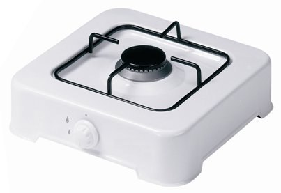 Wolnostojąca kuchenka gazowa jednopalnikowa o mocy całkowitej 1840 W, w kolorze białym, sterowana mechanicznie, z metalową obudową oraz z pojedynczym rusztem.