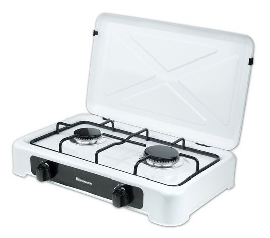 Kuchenka gazowa w kolorze białym, z metalową pokrywą i pojedynczym rusztem, dwupalnikowa o mocy całkowitej 3.71 kW.