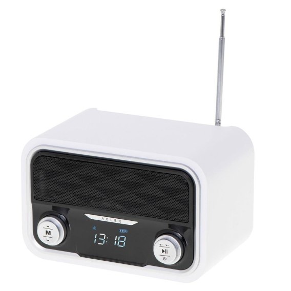 Informacje dodatkowe: AUX, Odtwarzanie karty SD, Odtwarzanie z USB, Odtwarzacz mp3, Bateria 1800 mAh, Ładowanie Micro USB, Biały wyświetlacz LCD, Pamięć 50 stacji