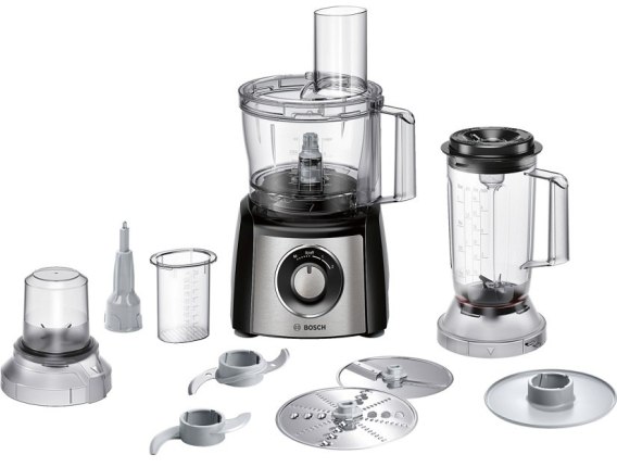 Popychacz, Pokrywa ochronna, Rozdrabniacz, Uchwyt do akcesoriów, Dzbanek miksera z tworzywa sztucznego, Tarcza do tarcia dwustronna, Tarcza do cięcia, Tarcza do ubijania, Nóz uniwersalny, Miska do mieszania z tworzywa sztucznego 500g