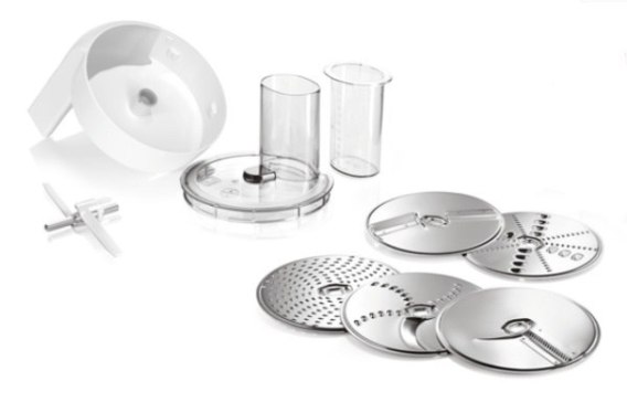 Rozdrabniacz, Dwustronna tarcza do krojenia na plasterki (grube i cienkie), Dwustronna tarcza do krojenia na wiórki (grube i cienkie), Tarcza do drobnego tarcia, Tarcza do krojenia warzyw na sposób Azjatycki, Tarcza do ścierania ziemniaków