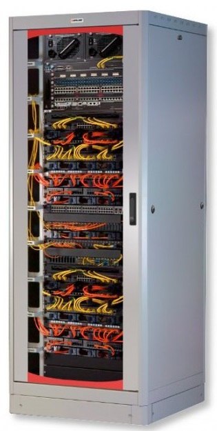 Stojąca szafa o wysokości montażowej 27U. Obciążenie statyczne do 500 kg.