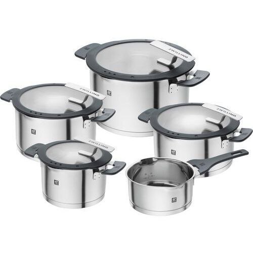Zestaw garnków wykonanych ze stali nierdzewnej. Garnki można myć w zmywarce i nadają się do indukcji.