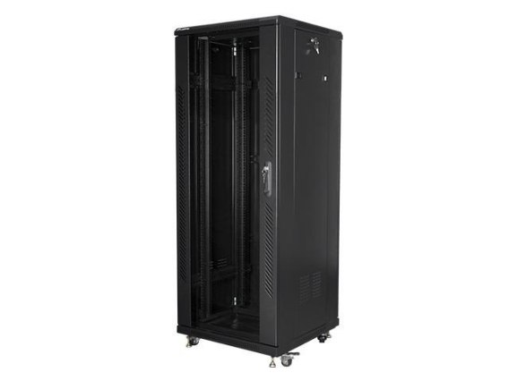 Informacje dodatkowe: Kolor: Czarny RAL9004, Panel podłogowy: 4 kółka z hamulcem + regulowane nóżki, Ładowność: Do 800 KG, Klasa szczelności: IP20, Panel wentylacyjny: 2 wentylatory 230V w górnej obudowie, Rodzaj drzwi: Przednie - Szyba hartowana, Tylnie - Stalowe, Zgodność ze standardami: ANSI/EIA RS-310D, IEC297-2, DIN41494; PART1 & PART7, ETSI, Materiał wykonania: Wysokiej jakości stal walcowana, malowana proszkowo, Grubość blachy: Profil montażowy - 2,00mm, Reszta - 1,2mm - 1,5mm, Otwory kablowe: Góra, Dół (regulowane), W zestawie: Akcesoria do mocowania, zamek drzwi przednich i tylnych, dwa zamki paneli bocznych, 20 śrub M6