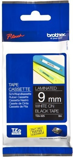 Taśma laminowana o szerokości 9mm, białym nadruku oraz czarnym tle. Długość taśmy wynosi 8 metrów.