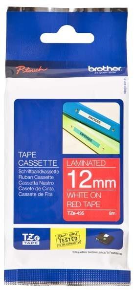 Taśma laminowana o szerokości 12mm, białym nadruku oraz czerwonym tle. Długość taśmy wynosi 8 metrów.