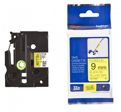 Taśma laminowana z czarnym nadrukiem na żółtym tle, o szerokości 9 mm. Długość taśmy wynosi 8 metrów.