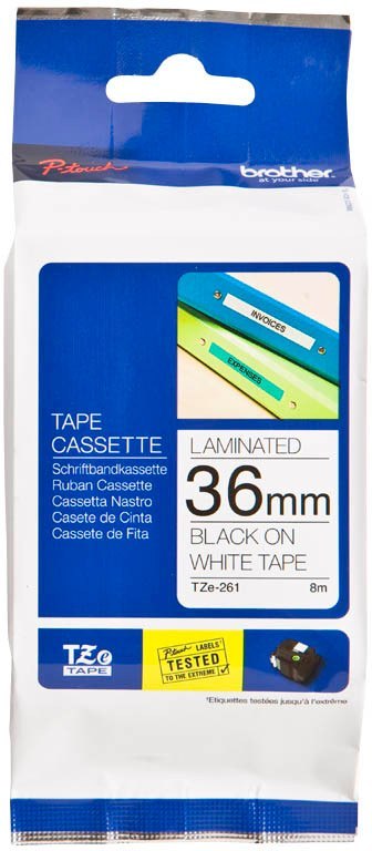 Taśma laminowana o szerokości 36 mm i długości 8 m, tło białe, nadruk czarny. Przeznaczona do urządzeń Brother: P-touch 9200PC, P-touch 550, P-touch 9200DX, P-touch 9400, P-touch 9500PC, P-touch 9700PC, P-touch 9800PCN, RL-700S, P-touch 3600, P-touch 9600.