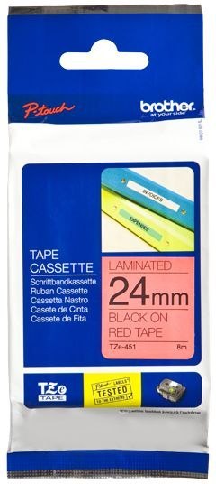 Taśma laminowana o szerokości 24mm, czarnym nadruku oraz czerwonym tle. Długość taśmy wynosi 8 metrów.