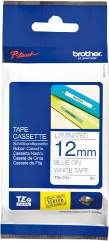 Taśma laminowana o szerokości 12mm, niebieskim nadruku oraz białym tle. Długość taśmy wynosi 8 metrów.