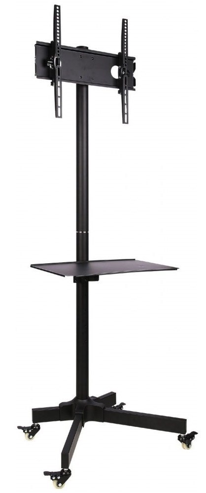 Stojak mobilny do montażu telewizora lub monitora o przekątnej ekranu od 23 do 55 cali. Maksymalne obciążenie wynosi 25 kg. Możliwość regulacji wysokości oraz kąta nachylenia. Wyposażony w półkę o wymiarach 485 x 293 mm oraz podstawę z 4 kółkami.