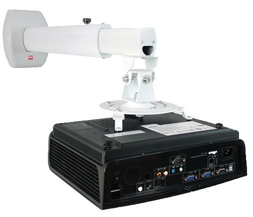 Ścienny uchwyt do projektora w kolorze białym. Maksymalne obciążenie: 12 kg. Możliwość pochylenia w osi projektora: plus, minus 42 stopnie. Odległość od punktu mocowania: 63.5 do 116.5 cm. Możliwość ukrycia przewodów w uchwycie. Materiał: aluminium. Maksymalny rozstaw otworów mocujących projektora wynosi 30 cm.
